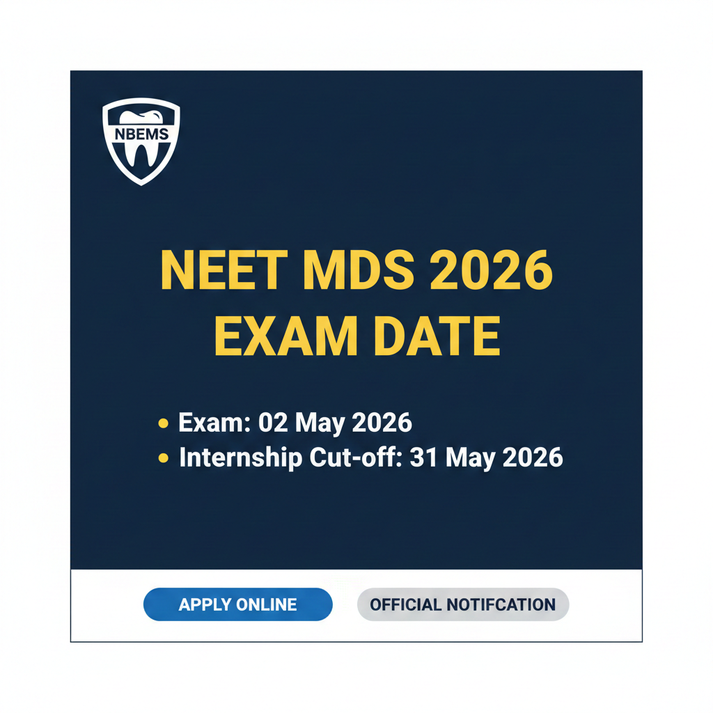 National Board of Examinations in Medical Sciences (NBEMS) has released the Examination Calendar for 2026. The NEET MDS 2026 entrance exam for admission to Master of Dental Surgery (MDS) courses will be conducted on May 02, 2026. Interested candidates can check the eligibility, exam dates, and internship cut-off details below.